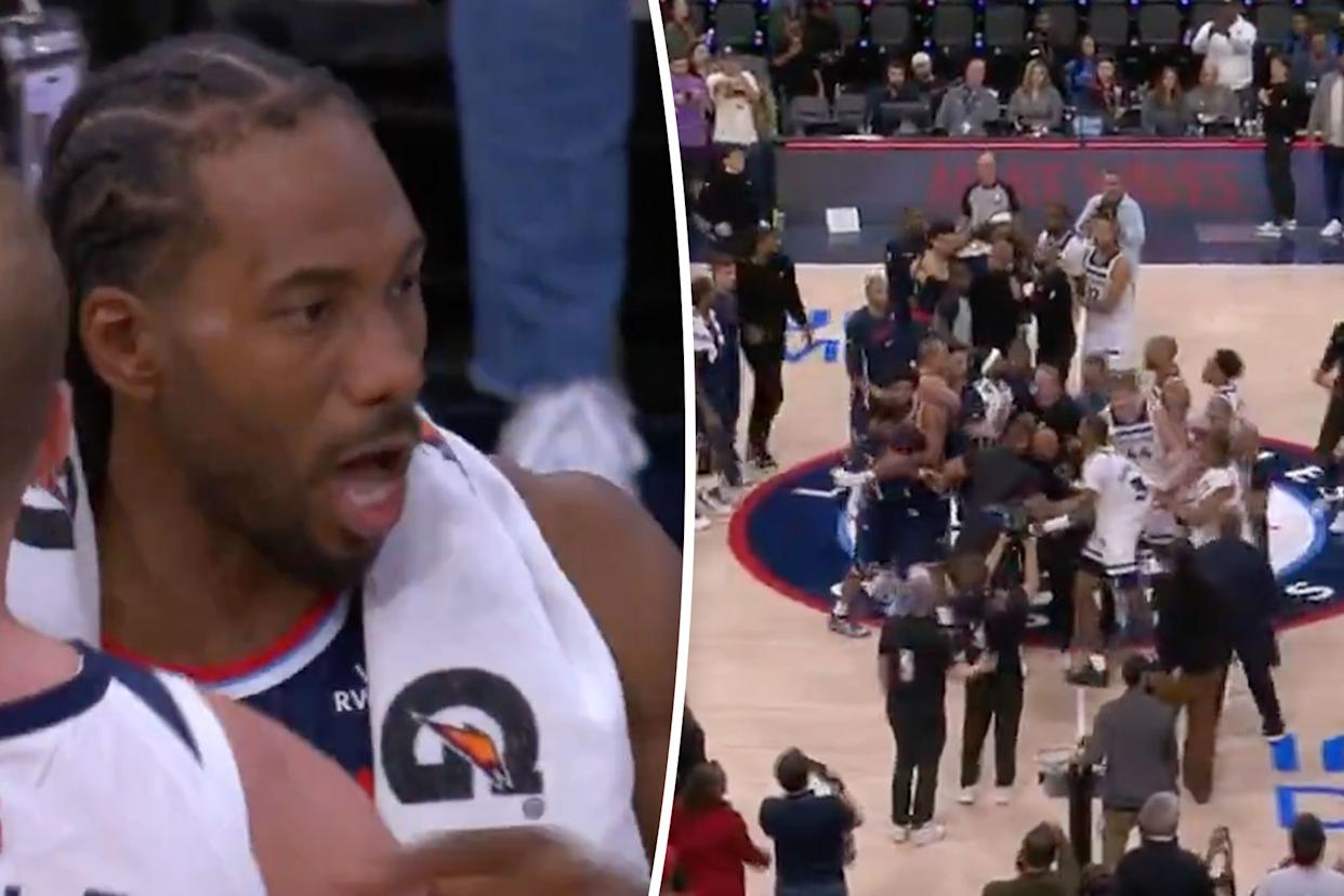 Just moments after Los Angeles beat up the Timberwolves, 153-128, in Inglewood, a skirmish between the two teams broke out — and Leonard’s funny response to it all was captured on broadcast cameras.