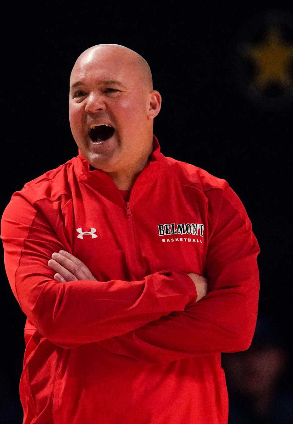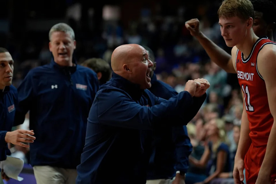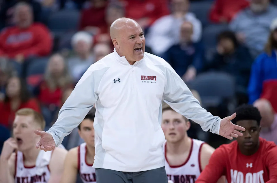 Belmont head coach Casey Alexander yells at his team during the first half of a first round NIT basketball game against Vanderbilt at Memorial Gymnasium Tuesday, March 15, 2022 in Nashville, Tenn.
