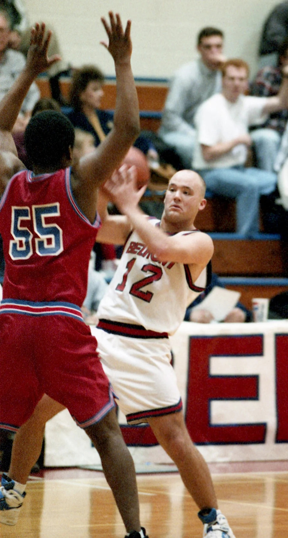 Belmont guard Casey Alexander (12) looks for an open teammate while being guarded by Marlon Brown (55) of Martin Methodist. Belmont improve their record to 20-1 with a 97-77 victory at home in Striplin Gym on Jan. 23, 1995.