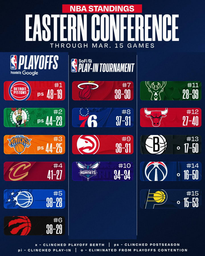 In the Eastern Conference, the Detroit Pistons remain at the #1 spot at 48-19, with the Boston Celtics four games out at #2, and the New York Knicks at #3. The Cleveland Cavaliers sit at #4, but below that is where it gets interesting. The surging and red hot Orlando Magic have moved up to the #5 position at 38-28, sitting a half game ahead of the Toronto Raptors (38-29).