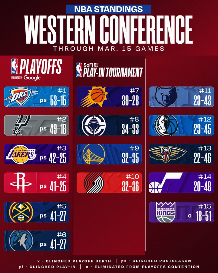 In the Western Conference, the Oklahoma City Thunder are still #1 with 53 wins, with the 49-18 San Antonio Spurs closing in. It’s still cluttered between #3 and #6, with the Los Angeles Lakers at 42-25, while the Houston Rockets are a half game behind them and holding the #4 position. The Denver Nuggets and the Minnesota Timberwolves hold identical 41-27 records, but a tiebreaker places Denver at #5, while Minnesota sits at #6.