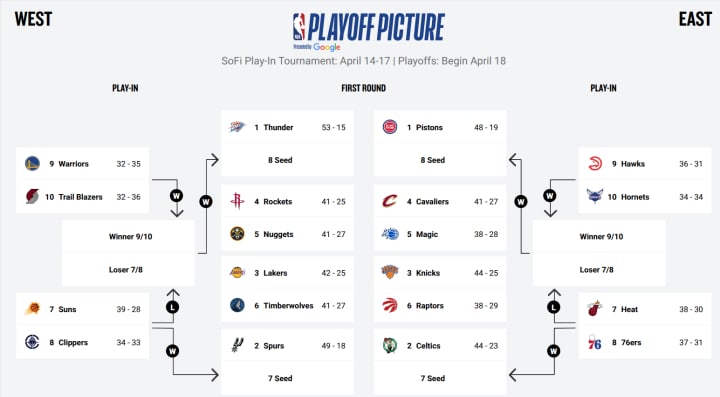 Regarding the Play-In picture, the Phoenix Suns sit at the #7 spot at 39-28, while the Los Angeles Clippers are at #8 at 34-33. The Golden State Warriors have lost five straight but still sit at #9, while the Portland Trail Blazers remain at #10. Overall, the past week saw seven teams join the postseason party, four from the West and three from the East, and as these standings show, they finally got the right letters up, because two weeks ago, they put the “x” next to OKC, but “x” means a playoff spot. OKC isn’t officially in the playoffs yet. As the pics show, they have the right letters: “ps” for postseason.