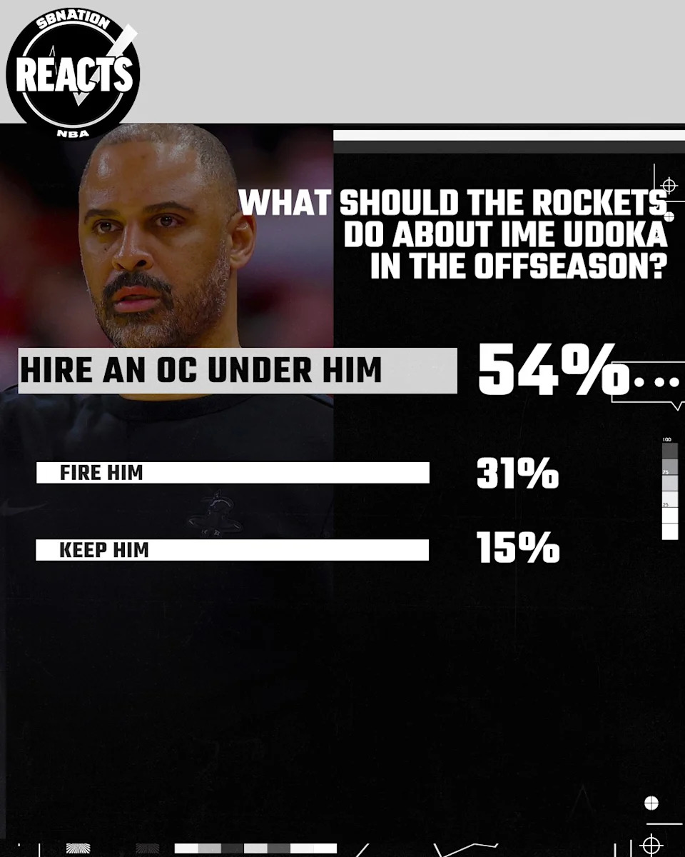 It was an interesting poll. A full 54 percent want Ime to have an OC next to him, while 31 percent want him fired. That’s a full 85 percent of Rockets fans are dis-satisfied with the way things are going for Udoka right now. Yikes.