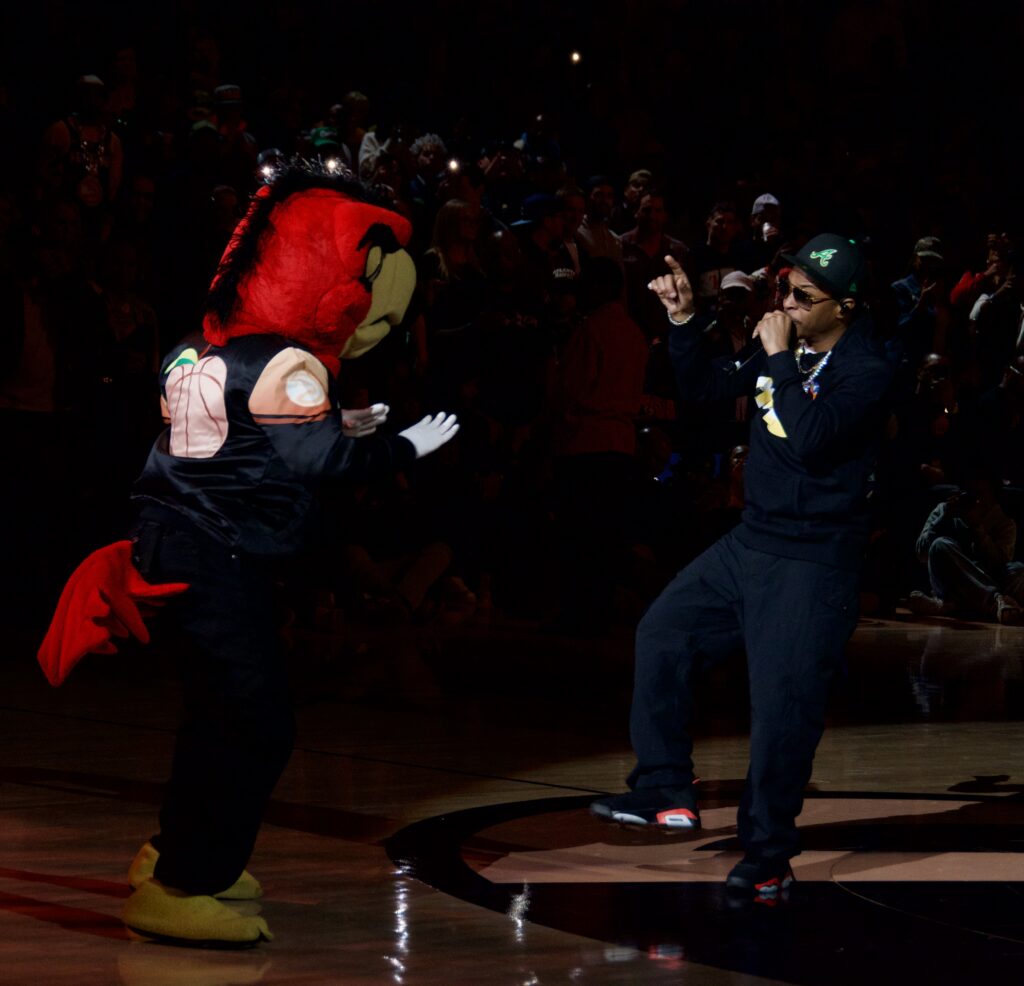 Atlanta recording artist T.I. rocked the State Farm Arena to perform during halftime on the night that the Atlanta Hawks had originally planned as a theme night honoring the famed Magic City Strip Club. The “King” emcee had fans and game watchers locked in as he performed throwback hits, “Rubber Band Man,” What You Know,” and traded an occasional two-step with the Hawks mascot. Just as the halftime wrapped up, Tip’s comrade and Grand Hustle label mate, Young Dro, hit the wood grain and gave the audience a nostalgic finish.