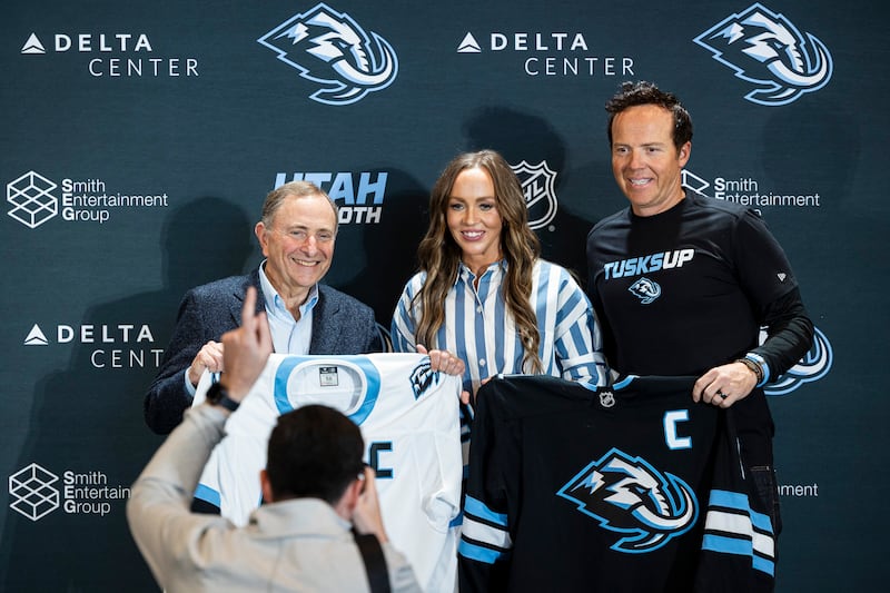 Ryan and Ashley Smith, co-owners of the Utah Mammoth and Smith Entertainment Group, are joined by NHL commissioner Gary Bettman as they pose with jerseys after a press conference announcing the Utah Hockey Club is changing their name to Utah Mammoth at the Delta Center in Salt Lake City on Wednesday, May 7, 2025. | Isaac Hale, Deseret News