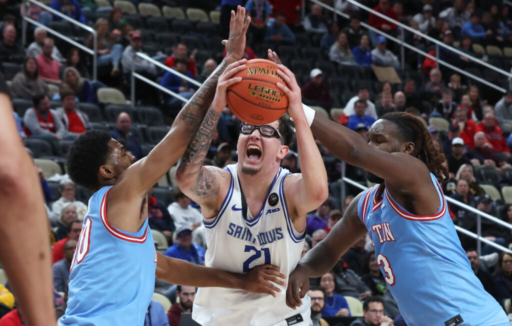 Mar 14, 2026; Pittsburgh, PA, USA; Saint Louis Billikens center Robbie Avila (21) drives to the basket between Dayton Flyers guard Bryce Heard (10) and forward Jaiun Simon (3) during the first half in an Atlantic 10 Conference Tournament Semifinal game at PPG Paints Arena. Mandatory Credit: Charles LeClaire-Imagn Images