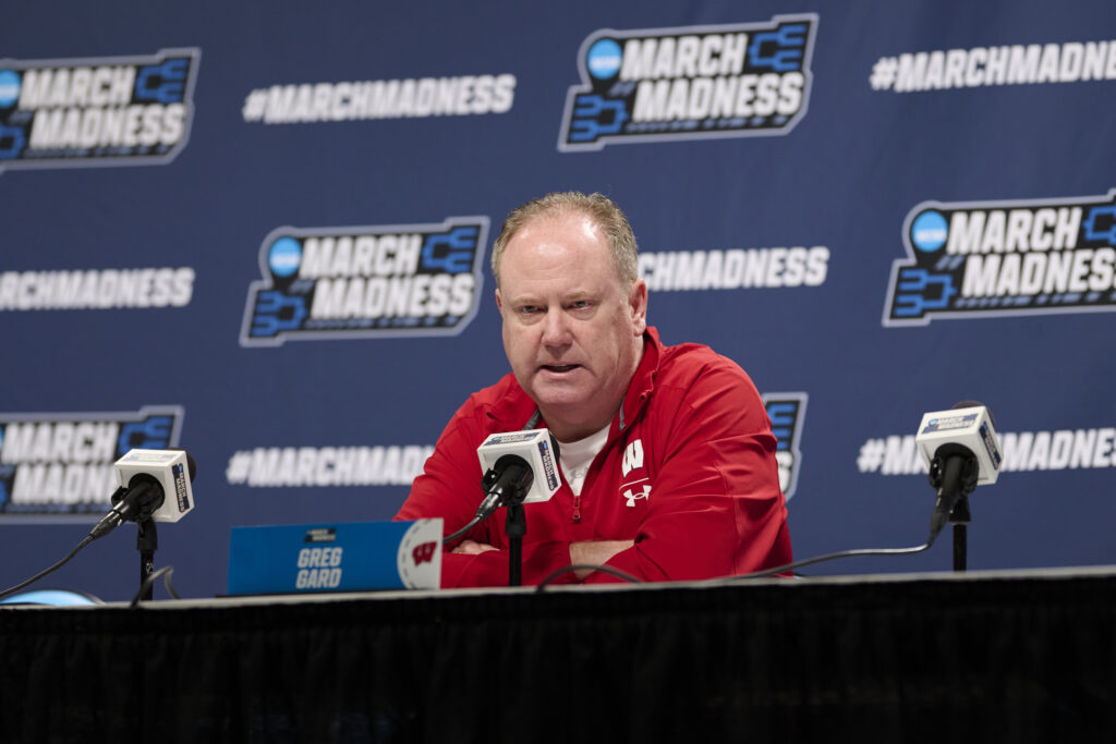 Mar 18, 2026; Portland, OR, USA; Wisconsin Badgers head coach Greg Gard answers questions during a press conference before a practice session ahead of the first round of the men’s 2026 NCAA Tournament at Moda Center. Mandatory Credit: Troy Wayrynen-Imagn Images
