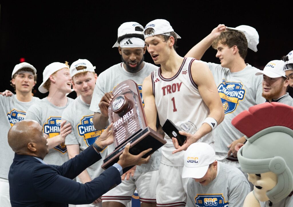 Trojans Thomas Dowd (1) is handed the trophy following their 77-61 victory over the Eagles during the Georgia Southern vs Troy men’s Sun Belt Conference Championship basketball game at the Pensacola Bay Center in Pensacola, Florida on March 9, 2026.