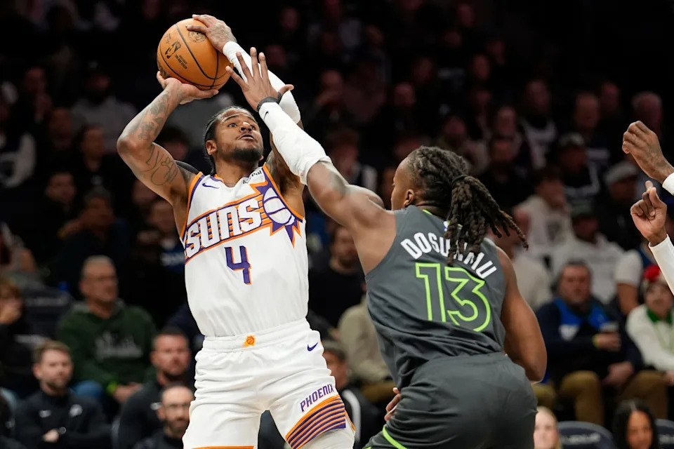 Phoenix Suns guard Jalen Green (4) shoots over Minnesota Timberwolves guard Ayo Dosunmu (13) in the second quarter at Target Center on March 17, 2026, in Minneapolis.