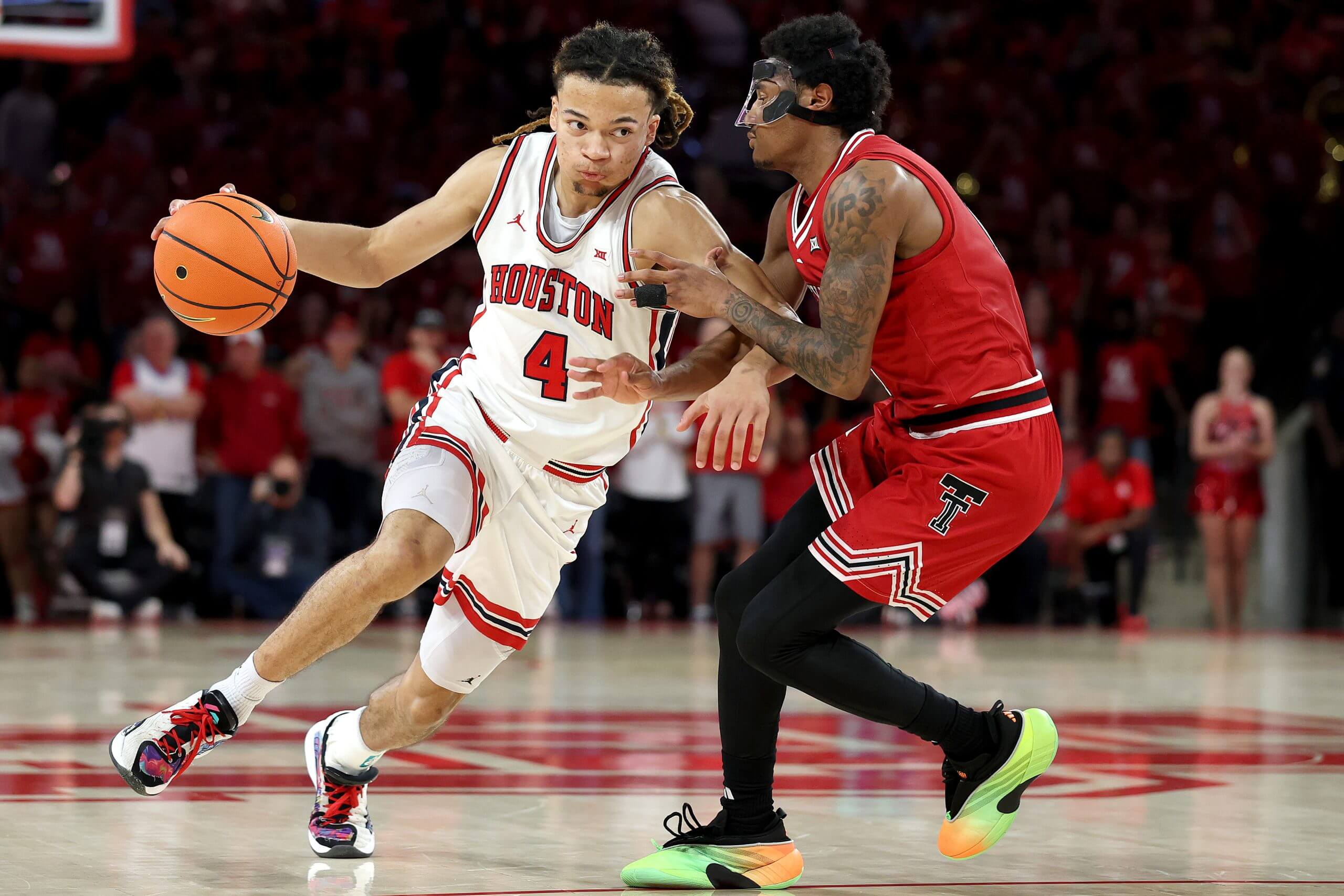 Houston guard Kingston Flemings (4) drives to the basket against Texas Tech’s Jaylen Petty during a Big 12 game in January. (Kenneth Richmond / Getty Images)