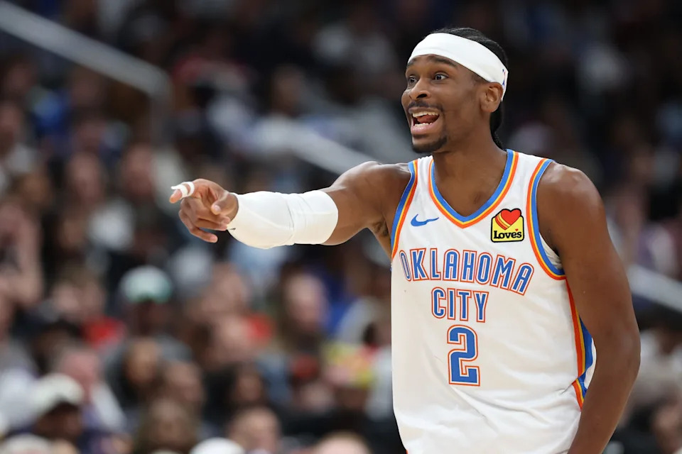 WASHINGTON, DC – MARCH 21: Shai Gilgeous-Alexander #2 of the Oklahoma City Thunder points against the Washington Wizards during the first half at Capital One Arena on March 21, 2026 in Washington, DC.