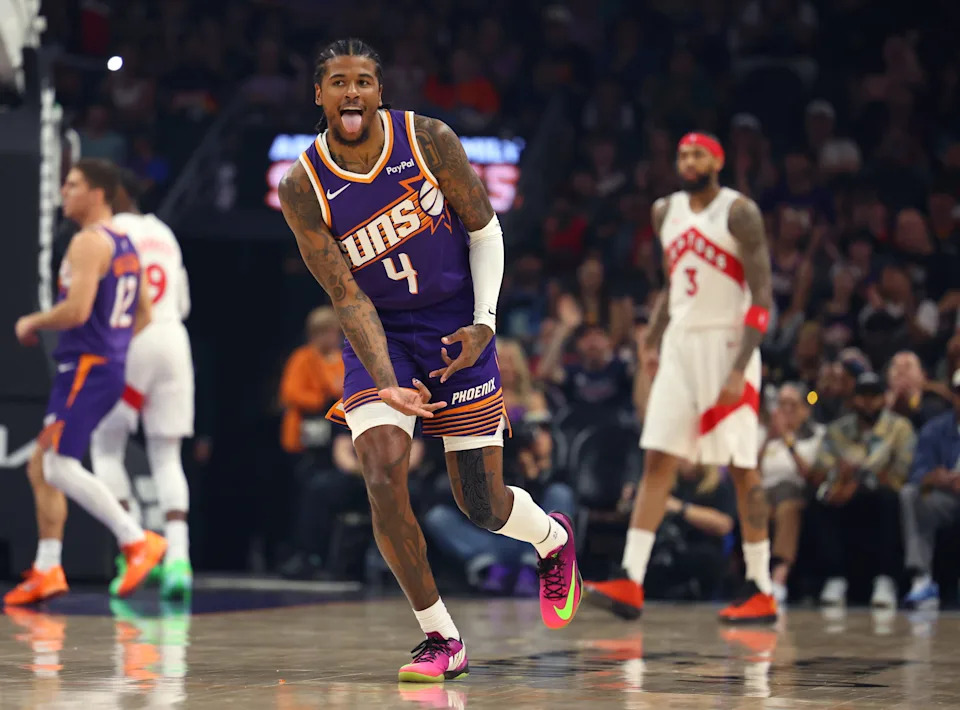 Phoenix Suns guard Jalen Green (4) celebrates after making a three-point shot against the Toronto Raptors in the first quarter at Mortgage Matchup Center in Phoenix on March 22, 2026.