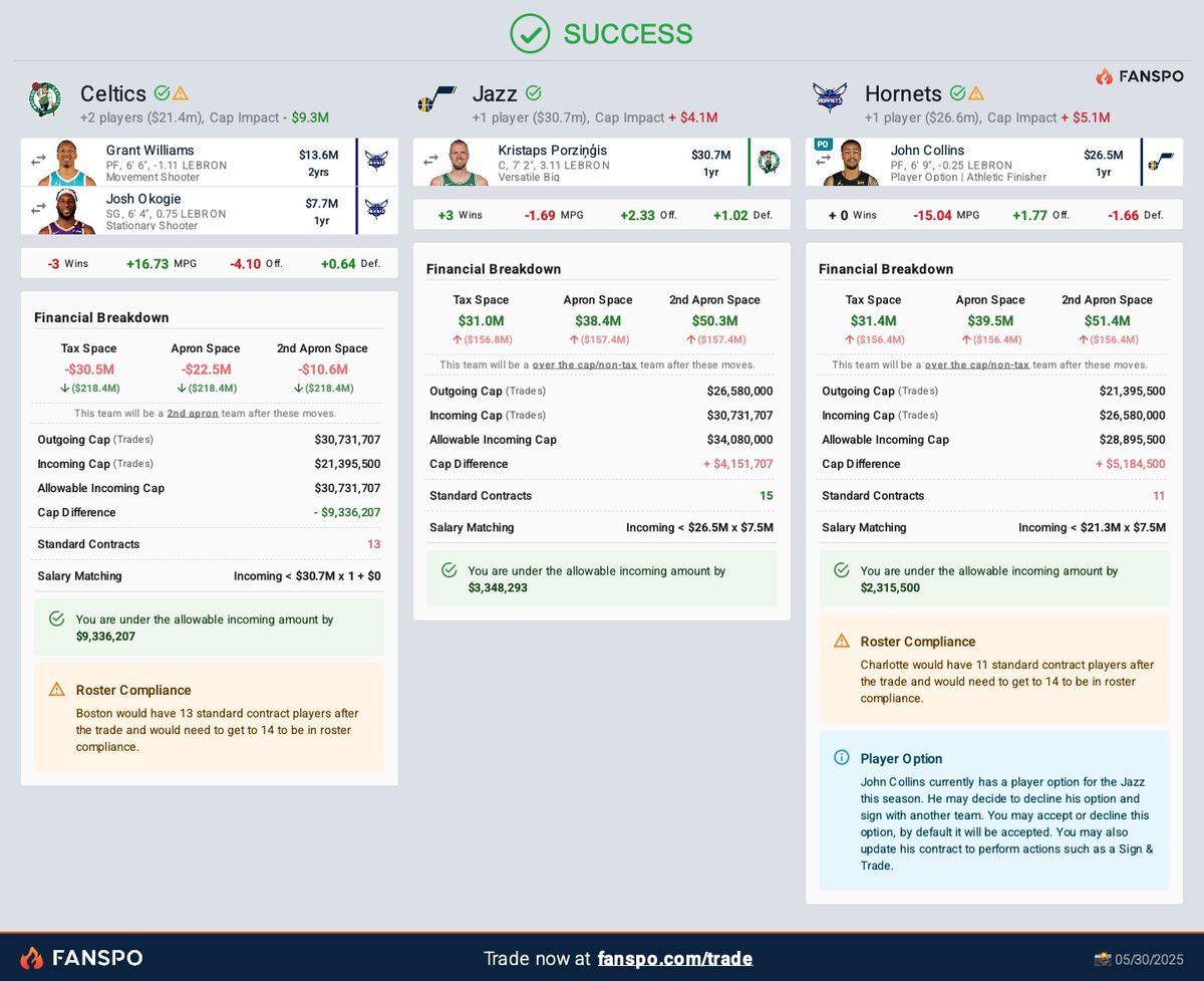 If Utah has interest again, there could be a deal where Boston could send Porzingis to the Jazz who send John Collins to the Hornets who send Grant Williams and Josh Okogie to the Celtics. That deal would save the Celtics $9 million and get them to $10 million over the 2nd apron.