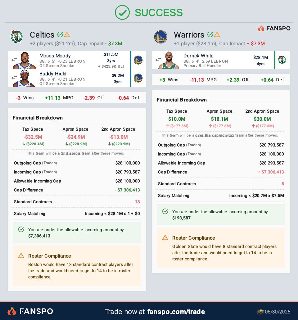 As a result, the Celtics could trade Derrick White to the Golden State Warriors for Buddy Hield, Moses Moody and first round picks in 2028, 2030 and 2032 (the 2030 pick is owed to the Wizards if it is 21-30 due to the Jordan Poole for Chris Paul trade).