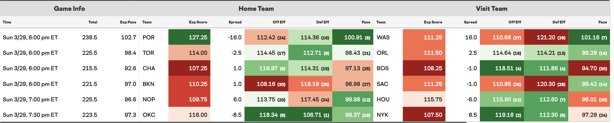 No total jumps out at us, though the WAS/POR projection is far ahead of the other matchups on the slate and we’re fairly represented with some options for Portland. Thunder-Knicks will be the biggest head-scratcher of Sunday night. They only generated 203 points during their last meeting while players from both rosters come in with salaries that I believe are overinflated.