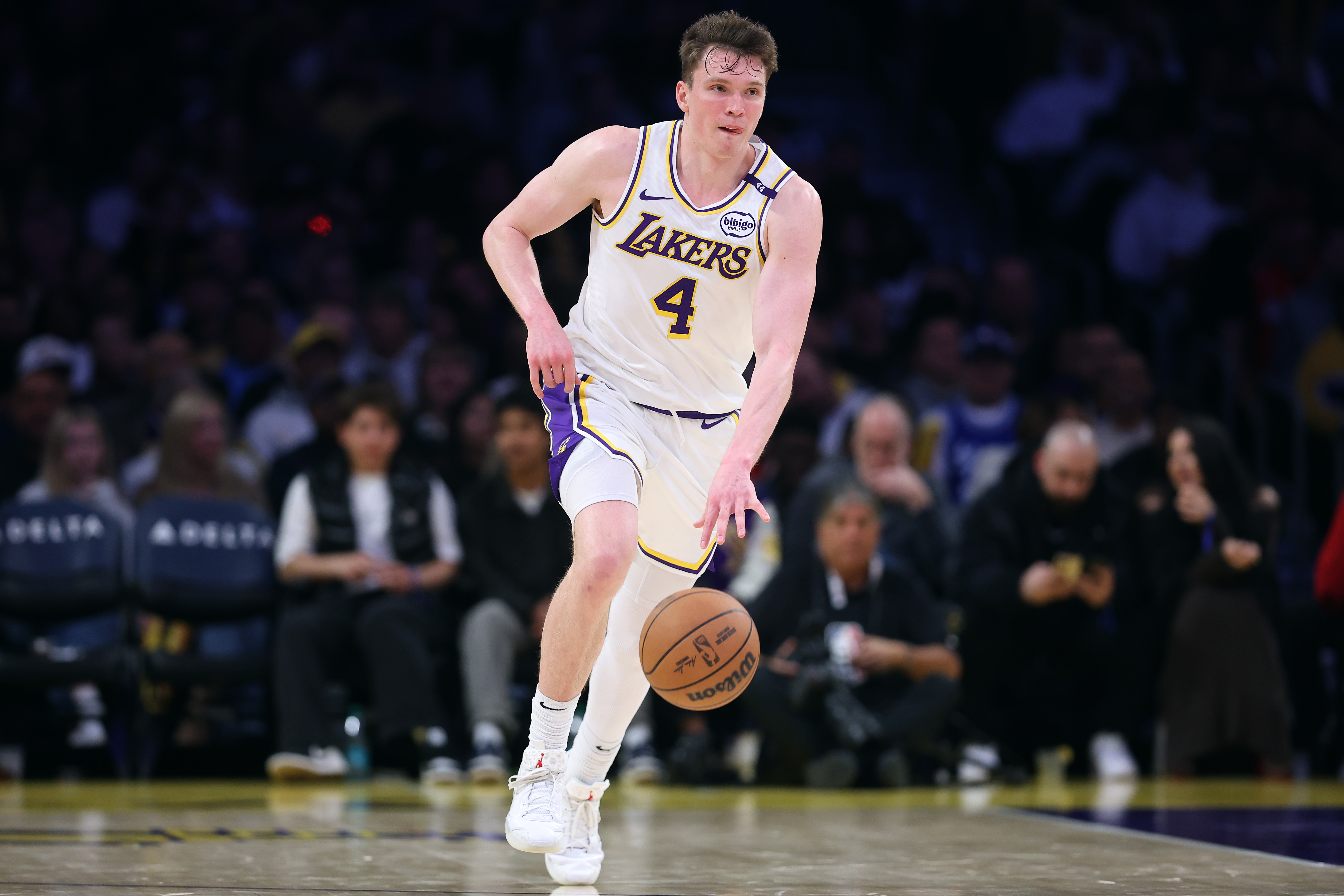 GettyDalton Knecht #4 of the Los Angeles Lakers dribbles upcourt during the second half of a game against the Sacramento Kings at Crypto.com Arena on December 28, 2024 in Los Angeles, California.
