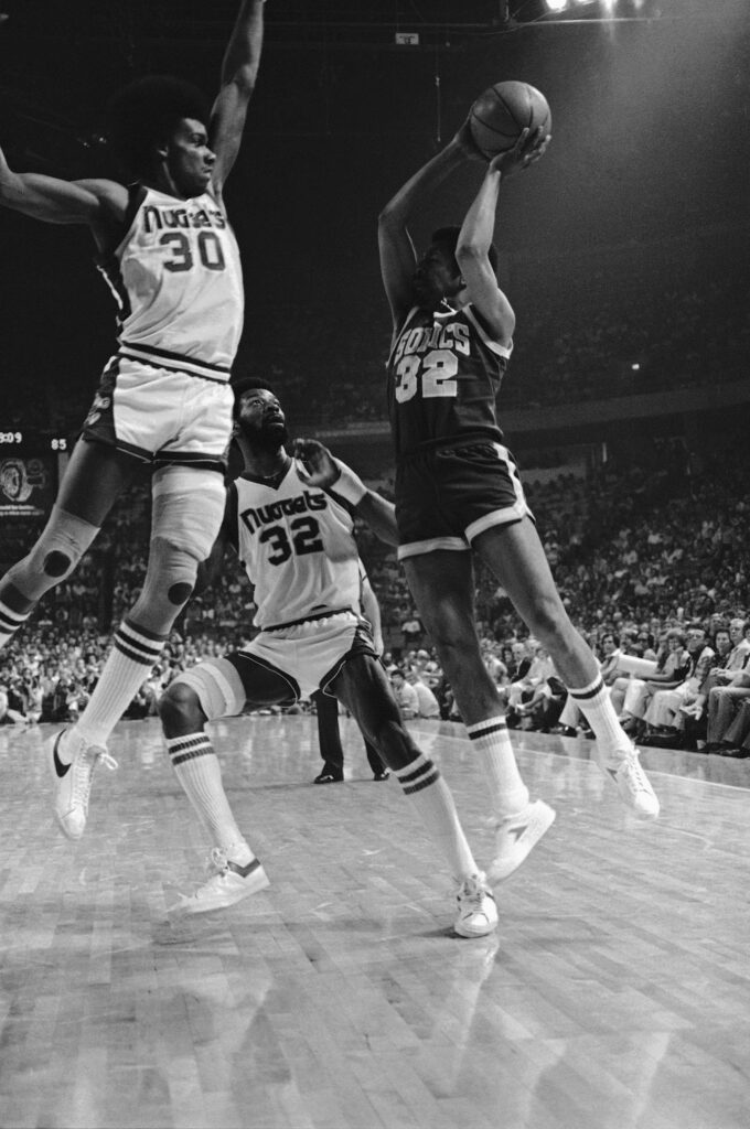 Denver Nuggets Darnell Hillan (#30) and Bobby Wilkerson surround Seattle Sonics sharpshooter Fred Brown during first; quarter action on Sunday, May 15, 1978 in Denver. After averaging nearly 17 points a game against Denver in the playoffs, Brown was held by Wilkerson to just four points as Denver won to send the sixth game back to Seattle. (AP Photo)