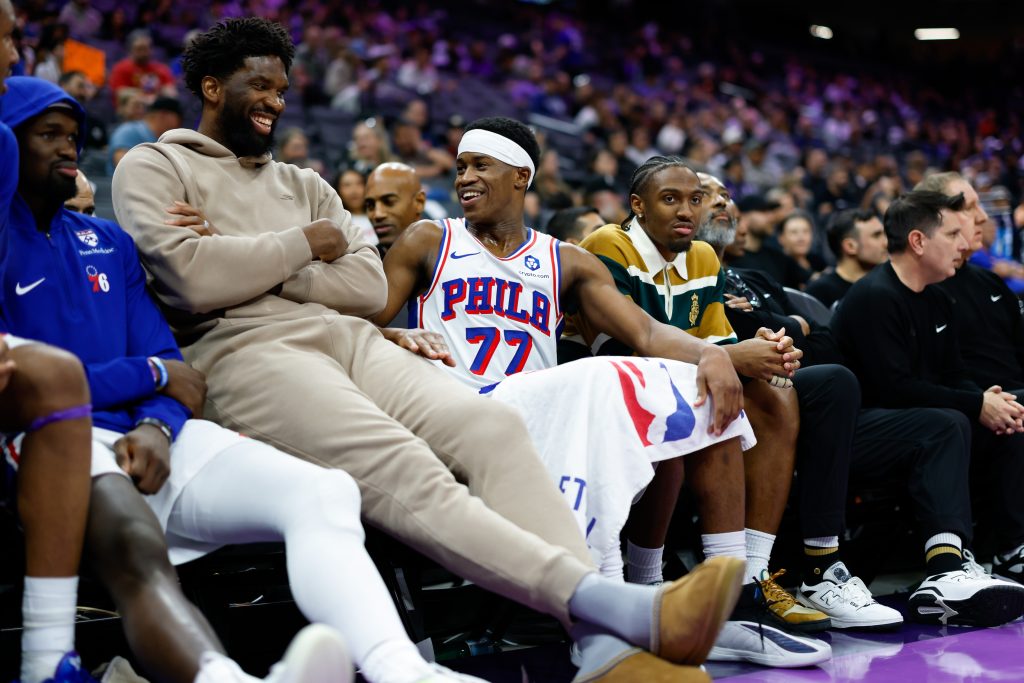 Mar 19, 2026; Sacramento, California, USA; Philadelphia 76ers guard Vj Edgecombe (77) laughs with Philadelphia 76ers center Joel Embiid (21) during the fourth quarter against the Sacramento Kings at Golden 1 Center. Mandatory Credit: Sergio Estrada-Imagn Images