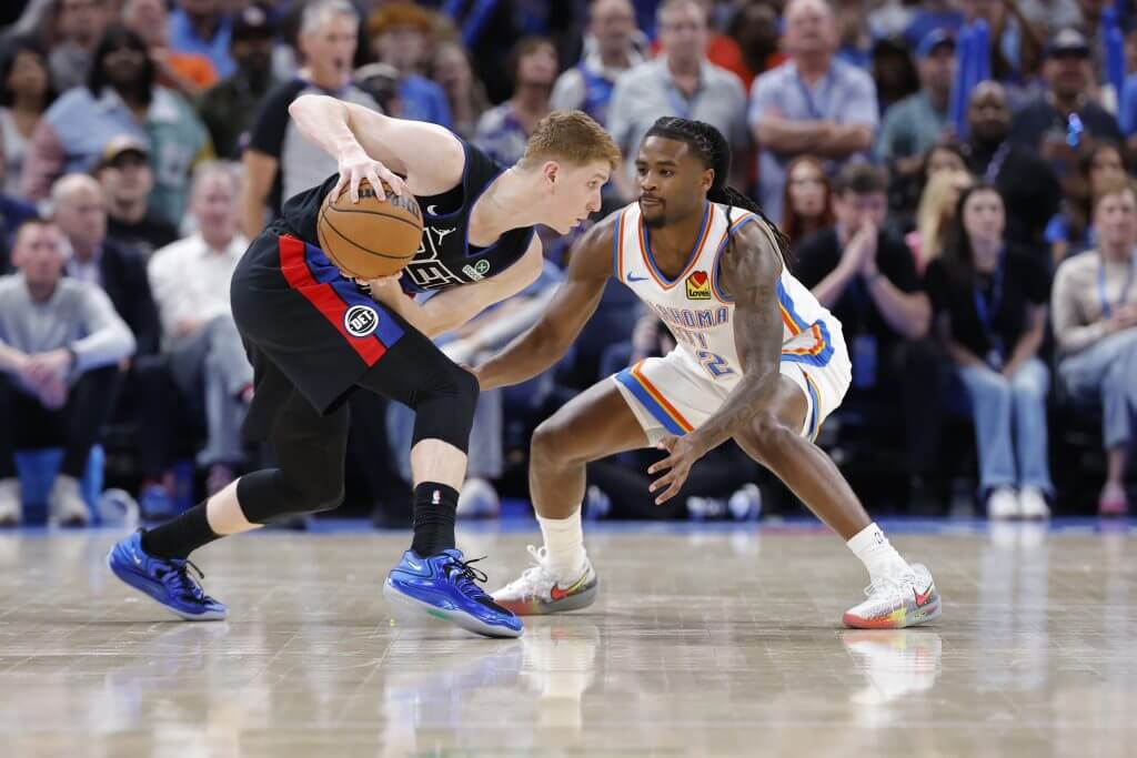 OKC’s Cason Wallace clamps down on Detroit’s Kevin Huerter in a matchup between the No. 1 seeds in each conference. (Alonzo Adams / Imagn Images)
