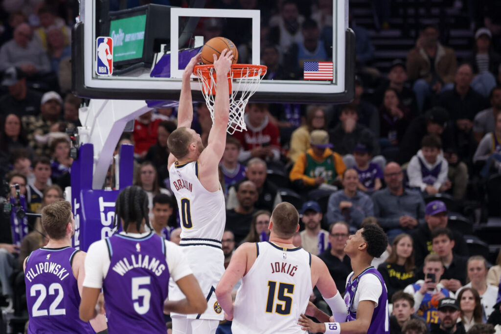 Apr 1, 2026; Salt Lake City, Utah, USA; Denver Nuggets guard Christian Braun (0) dunks the ball during the second quarter against the Utah Jazz at Delta Center. Mandatory Credit: Chris Nicoll-Imagn Images