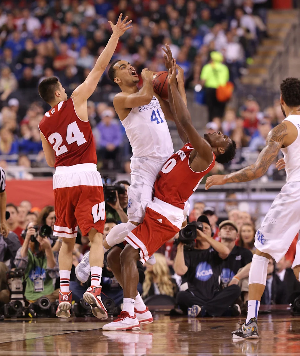 Kentucky Wildcats forward Trey Lyles (41) and Wisconsin Badgers forward Nigel Hayes (10) get tangled up during 2015 NCAA Final Four semi finals game of Wisconsin versus Kentucky Saturday, April 4, 2015 at Lucas Oil Stadium.