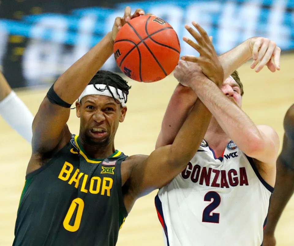 Baylor Bears forward Flo Thamba (0) and Gonzaga Bulldogs forward Drew Timme (2) fight for a rebound during the championship game of the 2021 NCAA Tournament on Monday, April 5, 2021, at Lucas Oil Stadium in Indianapolis, Ind.
