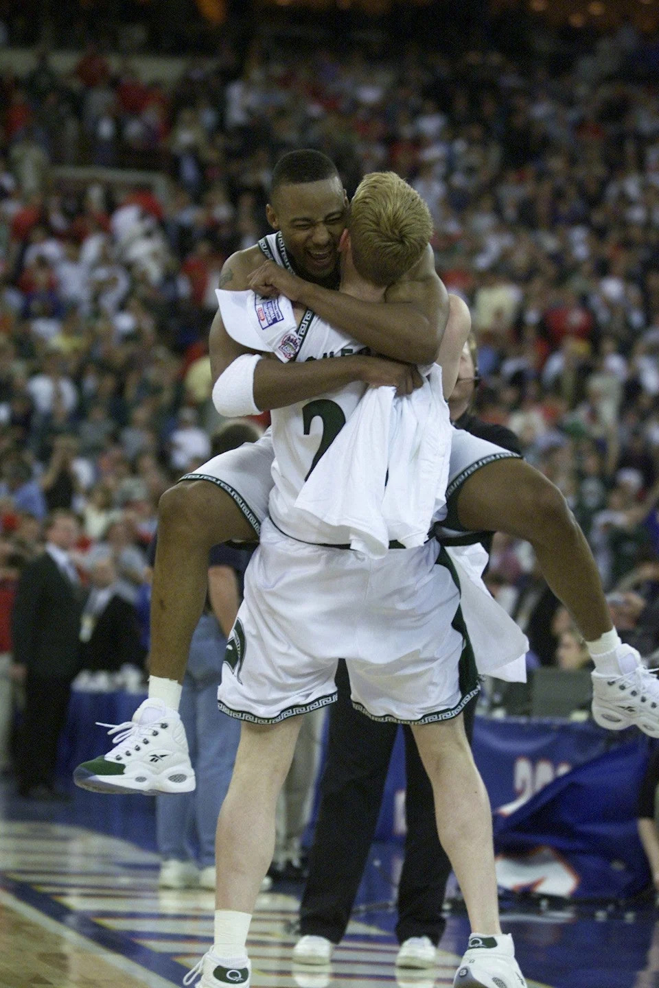 A tearful Mateen Cleaves celebrates with Tom Izzo after Michigan State defeated Florida to win the NCAA championship in 2000.