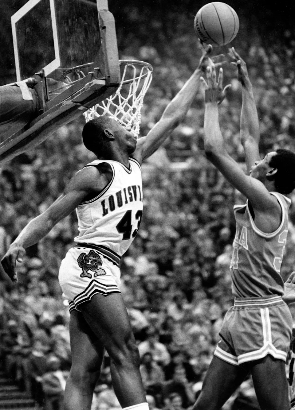 Mar 24, 1980; Indianapolis, IN USA: FILE PHOTO; Louisville Cardinals forward Derek Smith (43) blocks the shot of UCLA Bruins forward Cliff Pruitt (34) in the 1980 Final Four championship game at Market Square Arena. Louisville defeated UCLA 59-54. Mandatory Credit: Keith Williams/The Courier-Journal-USA TODAY Sports