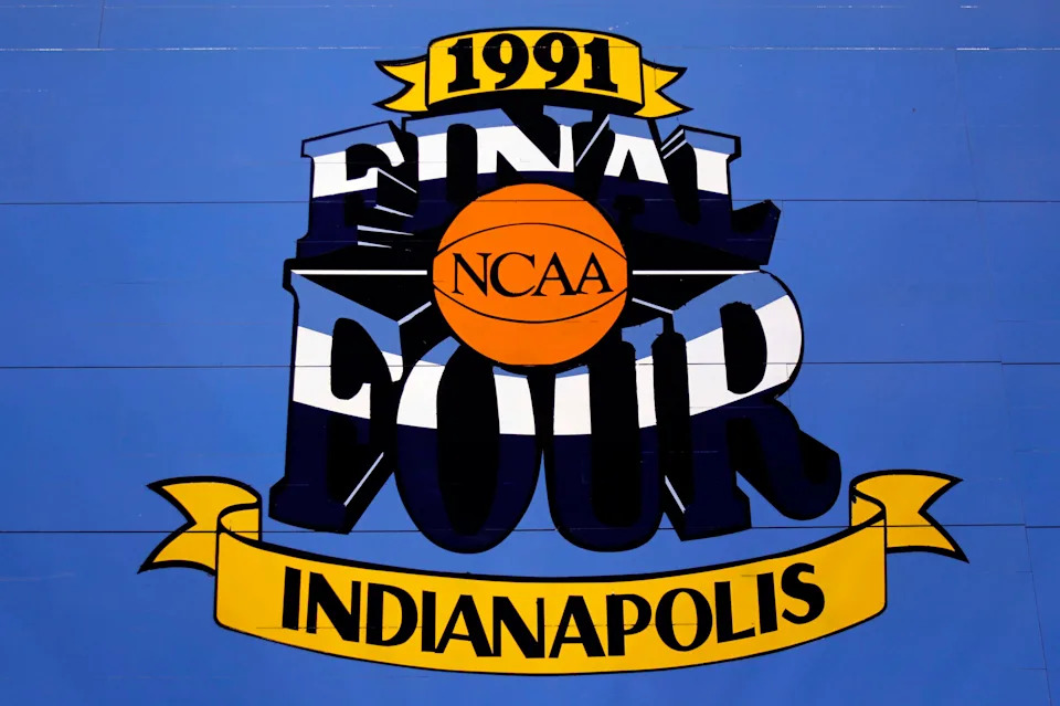 Apr 1, 2010; Indianapolis, IN, USA; A view of the 1991 Final Four logo in preparation for the Final Four of the 2010 NCAA mens basketball tournament at Lucas Oil Stadium. Mandatory Credit: Bob Donnan-USA TODAY Sports