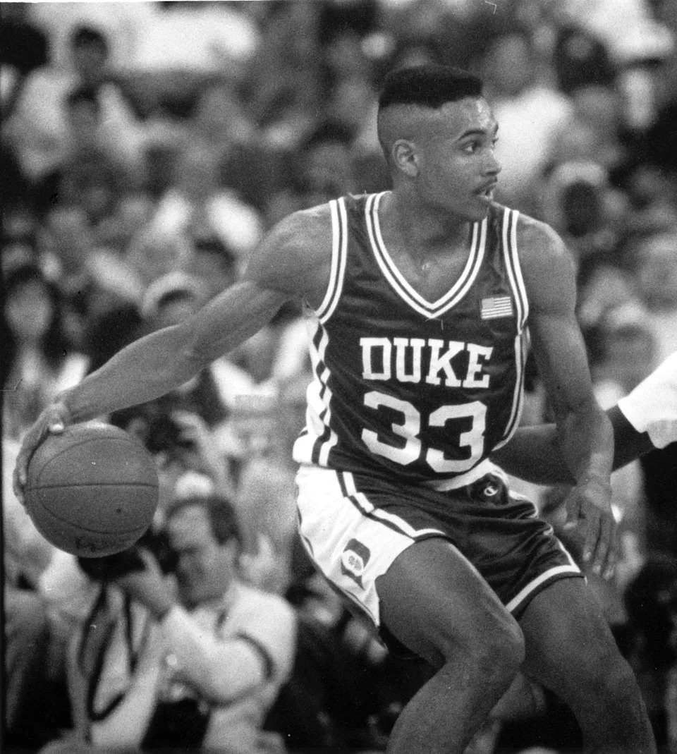 Duke?s Grant Hill looks for an opening against Larry Johnson in the semifinal game of the 1991 Final Four in Indianapolis.