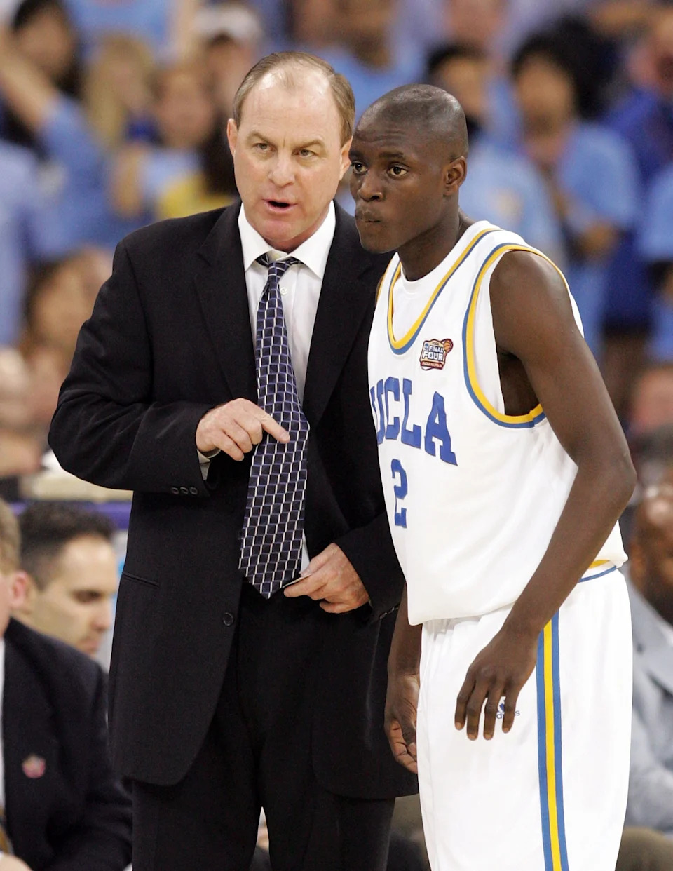 INDIANAPOLIS – APRIL 03: (L-R) Head coach Ben Howland talks with Darren Collison #2 of the UCLA Bruins in the game against the Florida Gators during the National Championship game of the NCAA Men’s Final Four on April 3, 2006 at the RCA Dome in Indianapolis, Indiana. The Gators defeated the Bruins 73-57 to become national champions. (Photo by Andy Lyons/Getty Images)