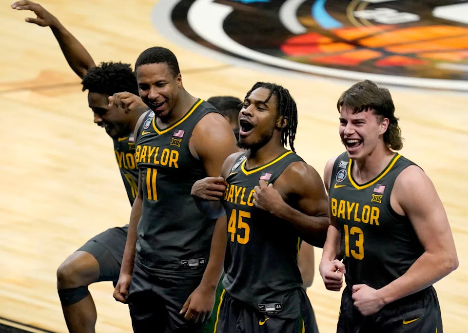 Baylor players including Baylor Bears guard Mark Vital (11), Baylor Bears guard Davion Mitchell (45) and Baylor Bears guard Jackson Moffatt (13) celebrate after defeating Gonzaga during the championship game of the 2021 NCAA Tournament on Monday, April 5, 2021, at Lucas Oil Stadium in Indianapolis, Ind.