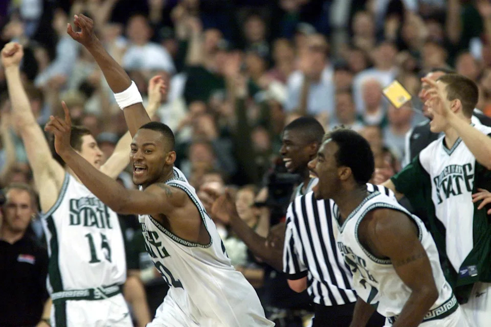 Michigan State’s Morris Peterson and Mateen Cleaves lead their teammates off the bench as they celebrate their 89-76 win over Florida in the national championship game on Monday, April 3, 2000, in Indianapolis.
