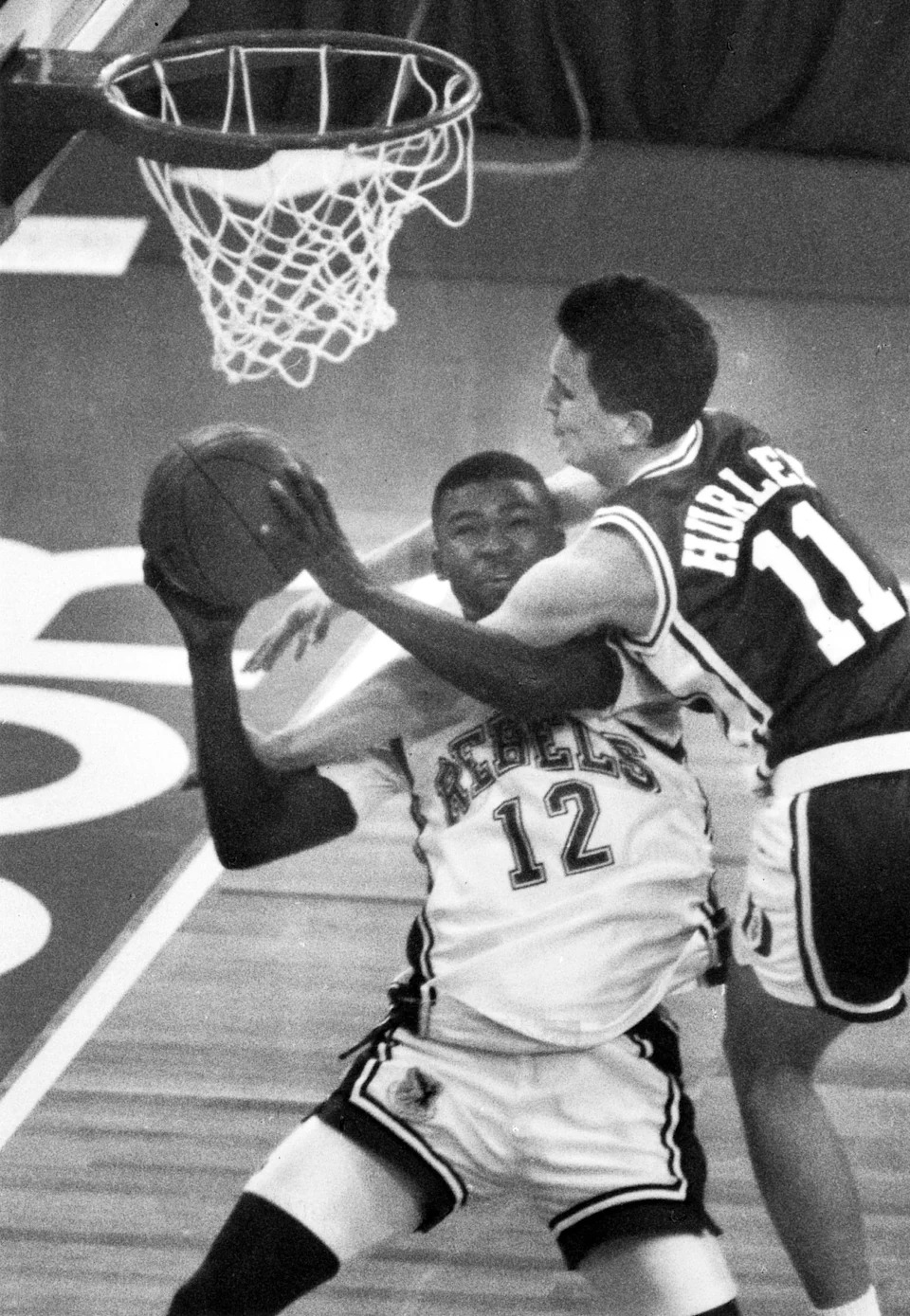 Duke?s Bobby Hurley fouls UNLV guard Anderson Hunt in the semifinal game of the 1991 Final Four in Indianapolis. (Rich Miller / photo)