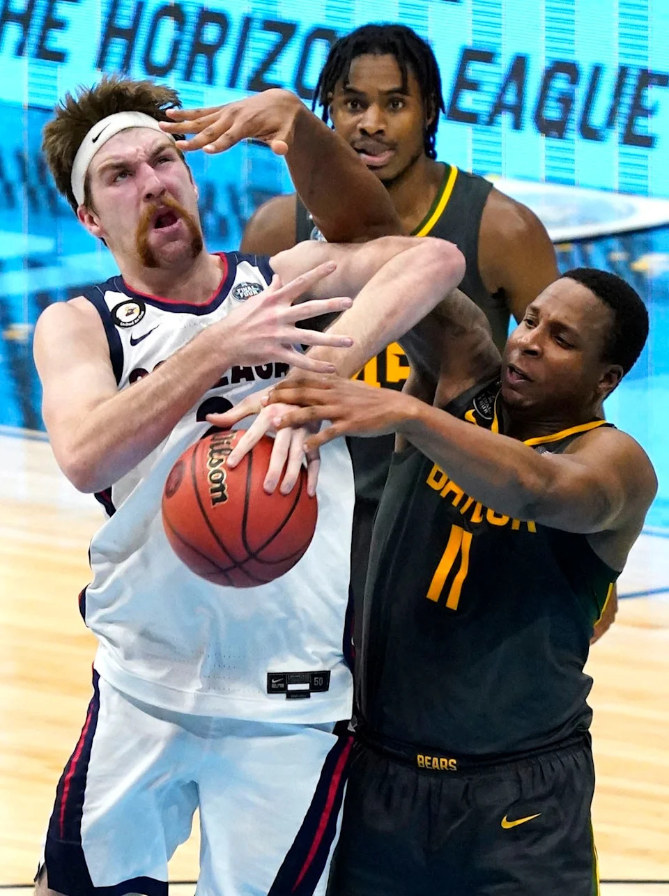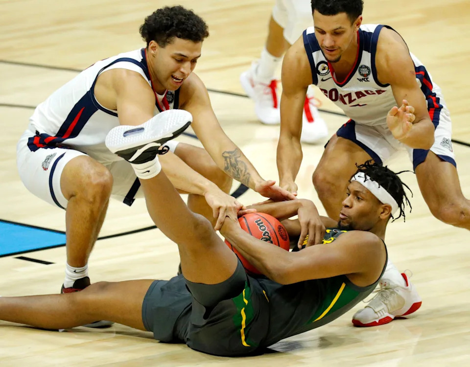 Baylor Bears forward Flo Thamba (0), Gonzaga Bulldogs forward Anton Watson (22) and Gonzaga Bulldogs guard Jalen Suggs (1) fight for a loose ball during the championship game of the 2021 NCAA Tournament on Monday, April 5, 2021, at Lucas Oil Stadium in Indianapolis, Ind.
