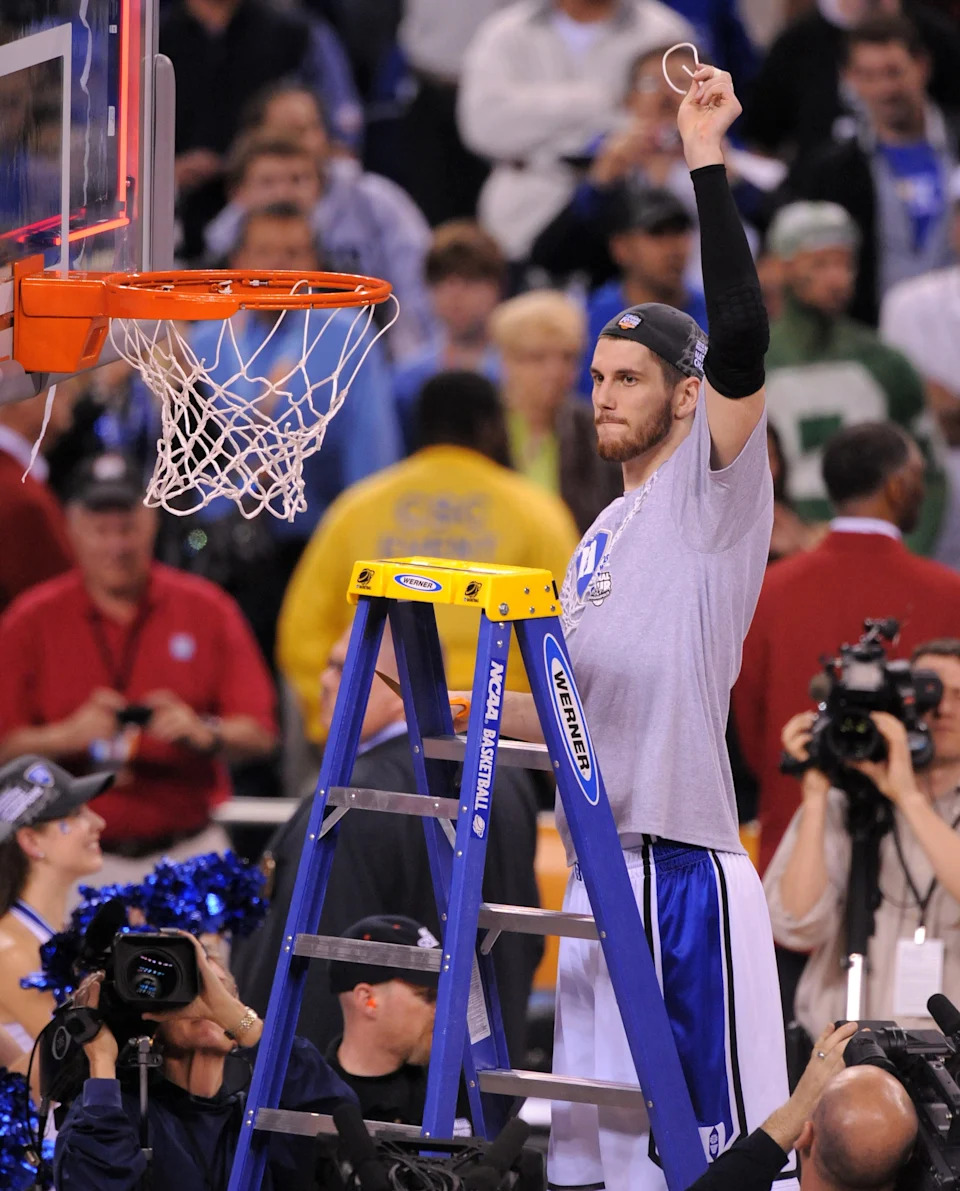 Duke center Brian Zoubek (55) shows his cut net after his team beat the Butler Bulldogs in the NCAA Final Four Division I Men’s Championship game at Lucas Oil Stadium in Indianapolis Sunday, April 5, 2010. (Matt Kryger / The Indianapolis Star)