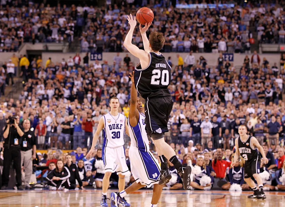 Butler guard/forward Gordon Hayward (20), middle, shoots and misses a desperation three-point basket just across half court to win the game. Duke University defeats Butler University, 61-59. Butler University faced Duke University in the championship game of the NCAA Final Four Division I Men’s Championships at Lucas Oil Stadium in Indianapolis Monday, April 5, 2010. (Sam Riche / The Indianapolis Star)