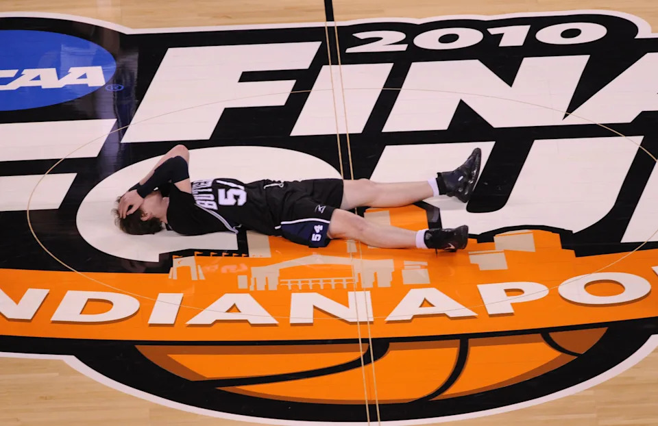 Butler forward Matt Howard (54) lies on the Final Four logo at mid court seconds after Butler guard/forward Gordon Hayward’s last second shot bounced off the rim. Butler University lost to the Duke University Blue Devils 61-59 in the championship game of the NCAA Final Four Division I Men’s Championships at Lucas Oil Stadium in Indianapolis Monday, April 5, 2010. (Matt Detrich / The Indianapolis Star)