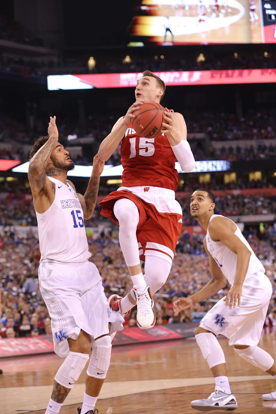 Wisconsin Badgers guard Bronson Koenig (24) goes for the basket against Kentucky Wildcats forward Willie Cauley-Stein (15) during 2015 NCAA Final Four semi finals game of Wisconsin versus Kentucky Saturday, April 4, 2015 at Lucas Oil Stadium.