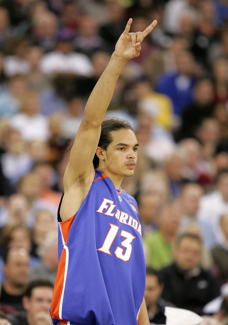 INDIANAPOLIS – APRIL 03: Joakim Noah #13 of the Florida Gators cheers on his team against the UCLA Bruins during the National Championship game of the NCAA Men’s Final Four on April 3, 2006 at the RCA Dome in Indianapolis, Indiana. The Gators defeated the Bruins 73-57 to become national champions. (Photo by Andy Lyons/Getty Images)