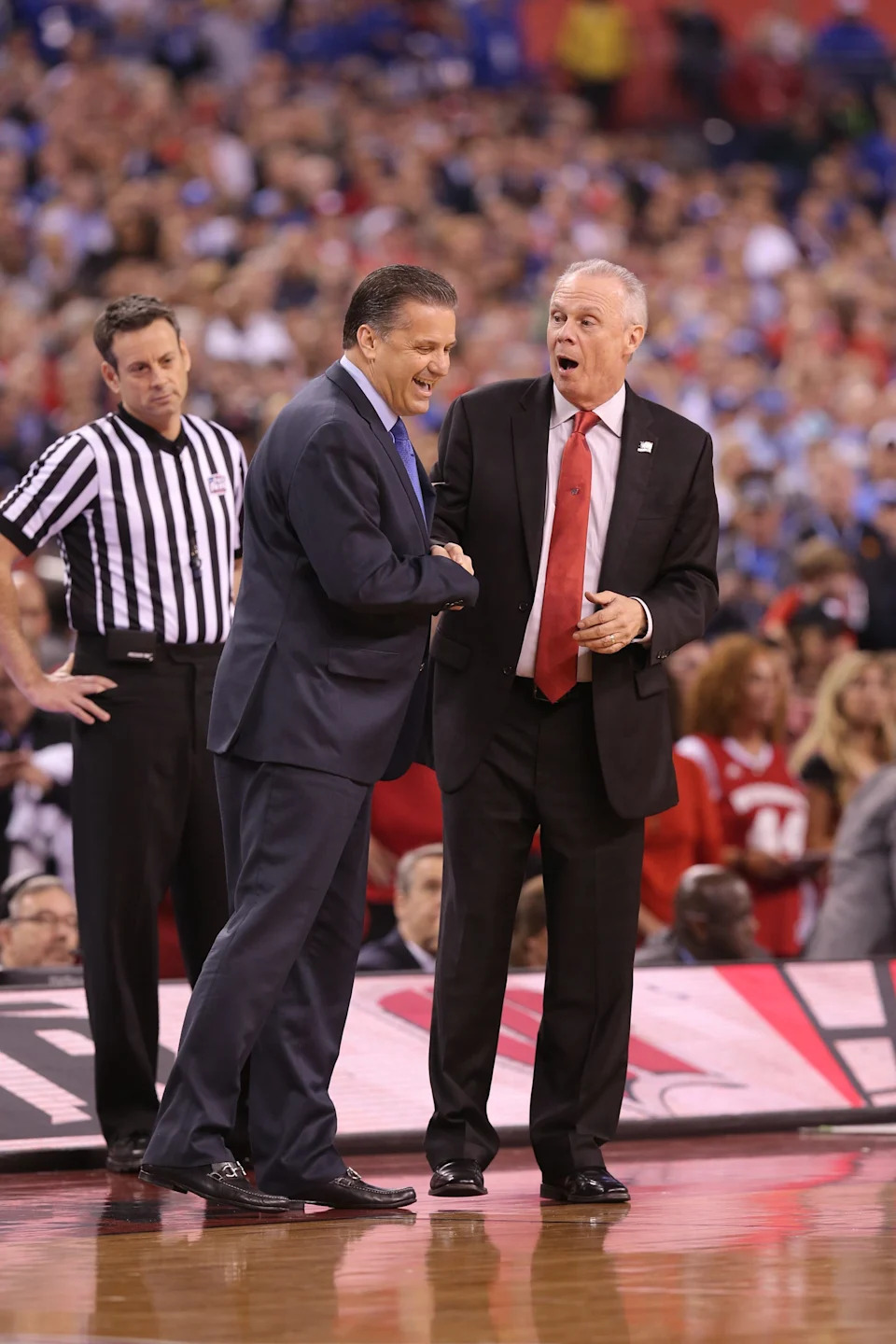 Kentucky Wildcats head coach John Calipari and Wisconsin Badgers head coach Bo Ryan exchange greetings before the start of the 2015 NCAA Final Four semi finals game of Wisconsin versus Kentucky Saturday, April 4, 2015 at Lucas Oil Stadium.