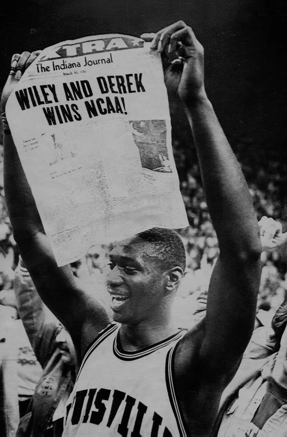 Mar 24, 1980; Indianapolis, IN USA: FILE PHOTO; Louisville Cardinals center Wiley Brown holds a mock newspaper as he celebrates their win over the UCLA Bruins in the 1980 Final Four championship game at Market Square Arena. Louisville defeated UCLA 59-54. Mandatory Credit: Keith Williams/The Courier-Journal-USA TODAY Sports