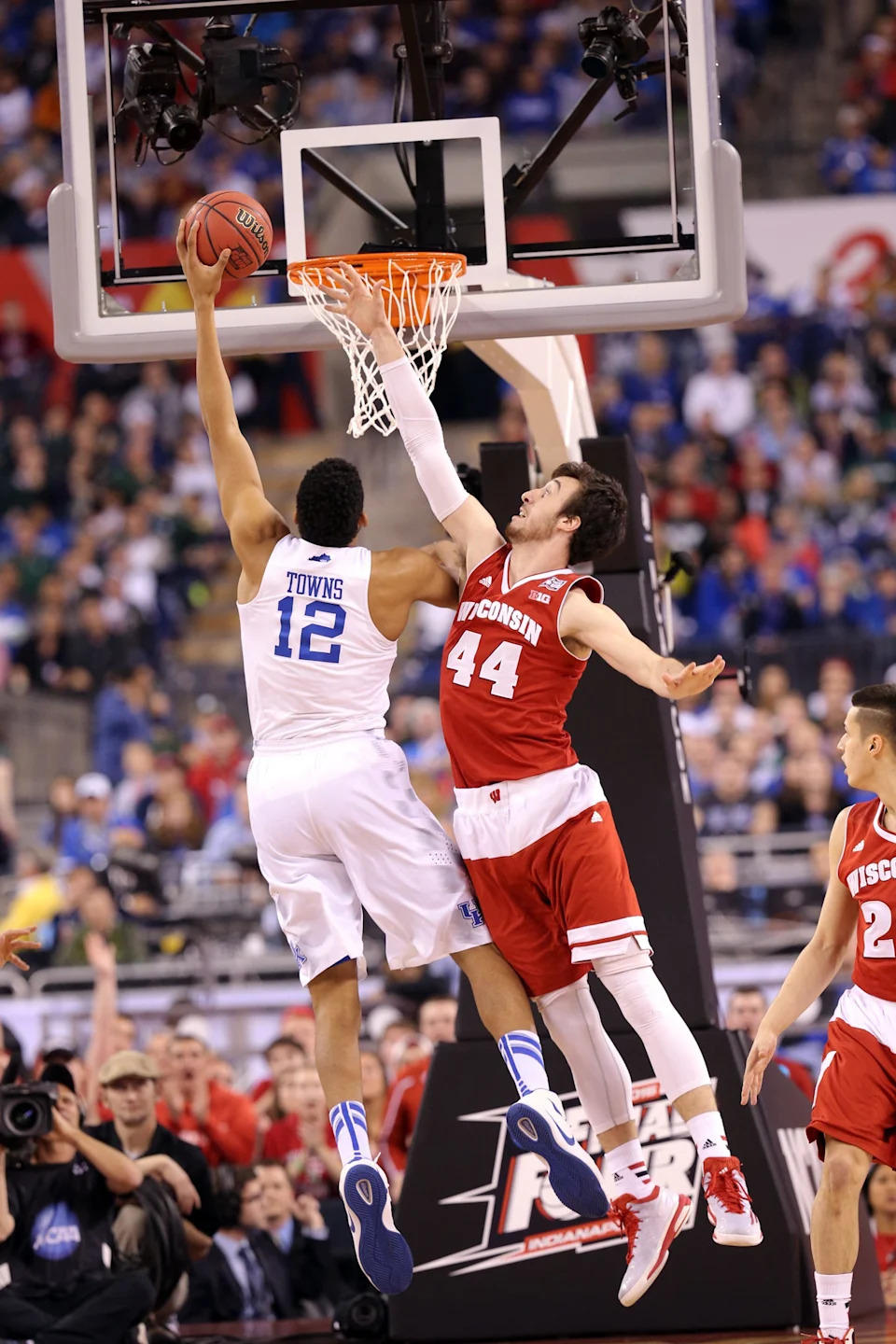 Kentucky Wildcats forward Karl-Anthony Towns (12) goes for the basket as Wisconsin Badgers forward Frank Kaminsky (44) tries to block in the first half of the 2015 NCAA Final Four semi finals game of Wisconsin versus Kentucky Saturday, April 4, 2015 at Lucas Oil Stadium.