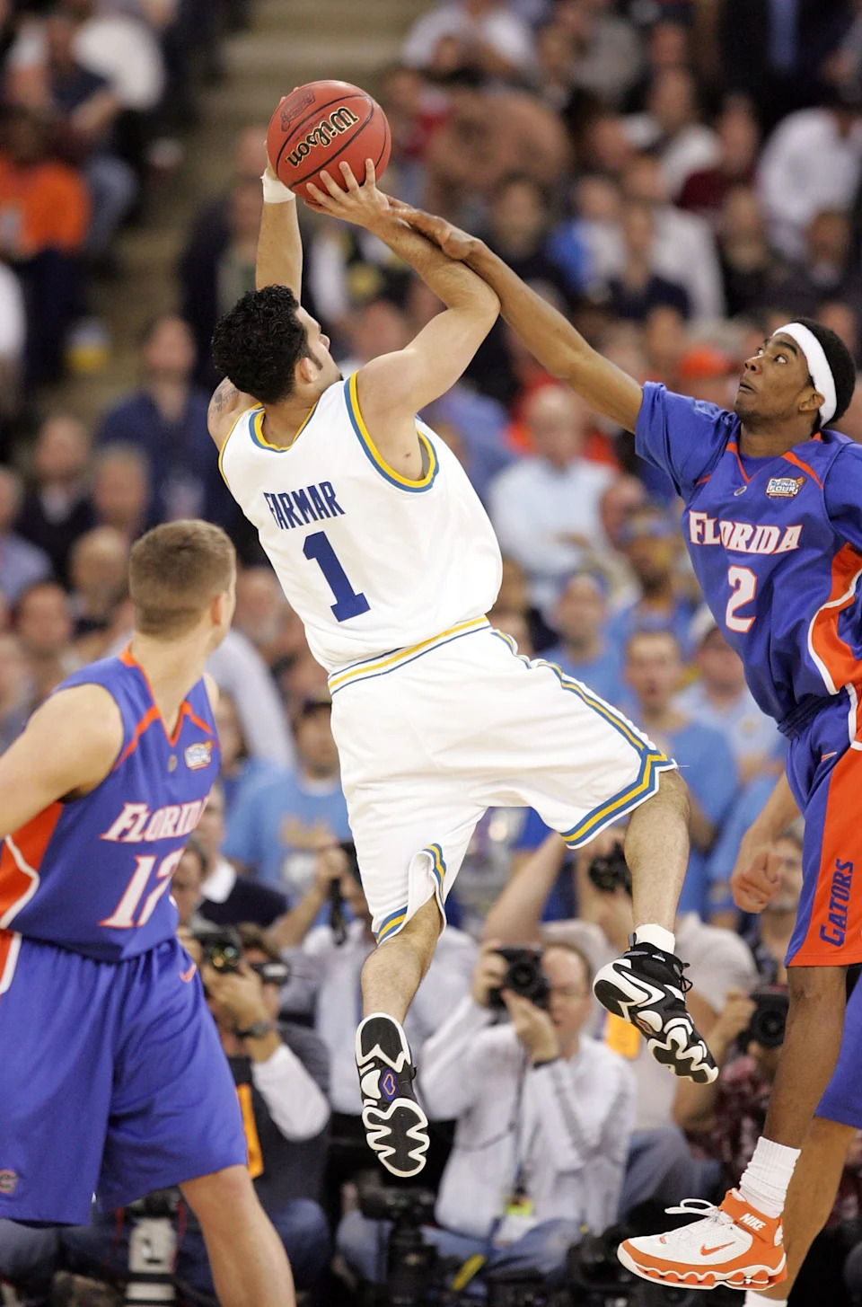 INDIANAPOLIS – APRIL 03: Jordan Farmar #1 of the UCLA Bruins shoots over Corey Brewer #2 of the Florida Gators and gets hit on the arm during the National Championship game of the NCAA Men’s Final Four on April 3, 2006 at the RCA Dome in Indianapolis, Indiana. The Gators defeated the Bruins 73-57 to become national champions. (Photo by Andy Lyons/Getty Images)