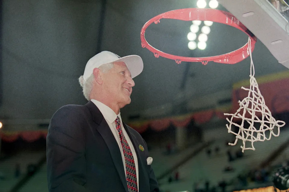 INDIANAPOLIS – MARCH 31: Head coach Lute Olson of University of Arizona Wildcats celebrates after winning the 1997 NCAA Championship Final game against Univeristy of Kentucky Wildcats at RCA Dome on March 31,1997 in Indianapolis, Indiana. The Wildcats won 84-79. NOTE TO USER: User expressly acknowledges and agrees that, by downloading and/or using this Photograph, User is consenting to the terms and conditions of the Getty Images License Agreement. Mandatory copyright notice: Copyright 1997 ( Photo by: Brian Bahr/Getty Images)