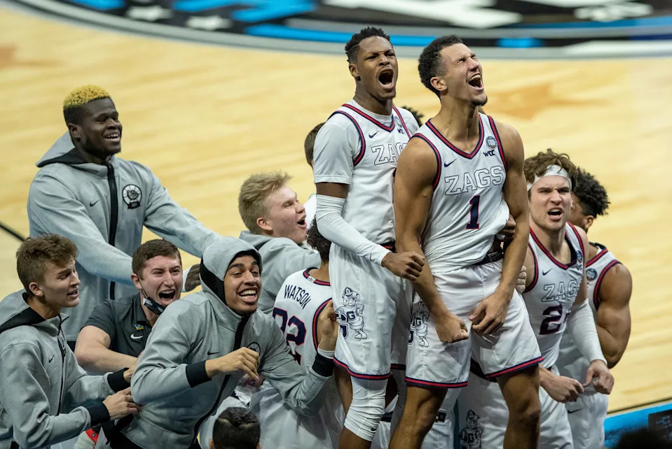 Gonzaga players celebrate after beating west coast rival UCLA in the NCAA Men’s Final Four, played at Lucas Oil Stadium, Indianapolis, on April 4, 2021. Gonzaga would go on to lose the national title against Baylor.