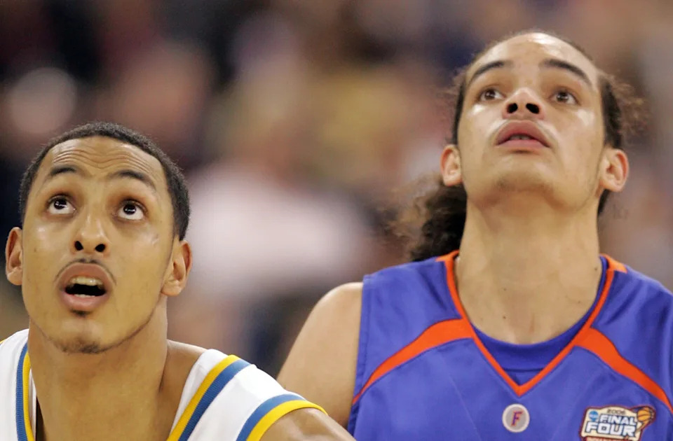 INDIANAPOLIS – APRIL 03: (L-R) Ryan Hollins #15 of the UCLA Bruins stands next to Joakim Noah #13 of the Florida Gators during the National Championship game of the NCAA Men’s Final Four on April 3, 2006 at the RCA Dome in Indianapolis, Indiana. The Gators defeated the Bruins 73-57 to become national champions. (Photo by Andy Lyons/Getty Images)