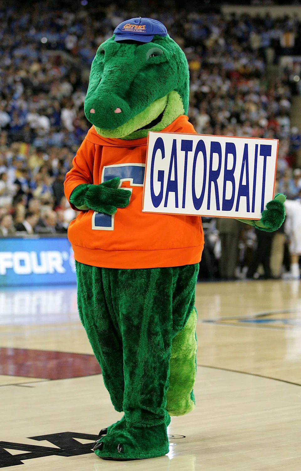 INDIANAPOLIS – APRIL 03: The Florida Gators mascot holds up a sign saying ‘Gatorbait’ against the UCLA Bruins during the National Championship game of the NCAA Men’s Final Four on April 3, 2006 at the RCA Dome in Indianapolis, Indiana. The Gators defeated the Bruins 73-57 to become national champions. The Gators defeated the Bruins 73-57 to become national champions. (Photo by Andy Lyons/Getty Images)