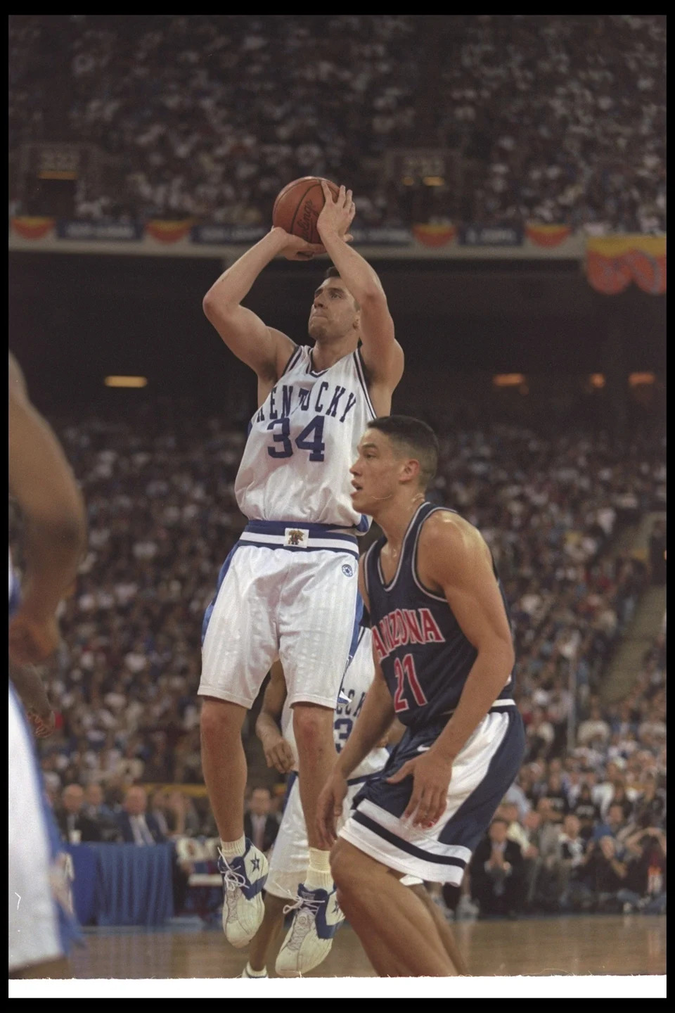 31 Mar 1997: Ray Allen of the Kentucky Wildcats (center) shoots the ball as an Arizona Wildcats player looks on during a championship game at the RCA Dome in Indianapolis, Indiana. Arizona won the game, 84-79. Mandatory Credit: Brian Bahr /Allsport
