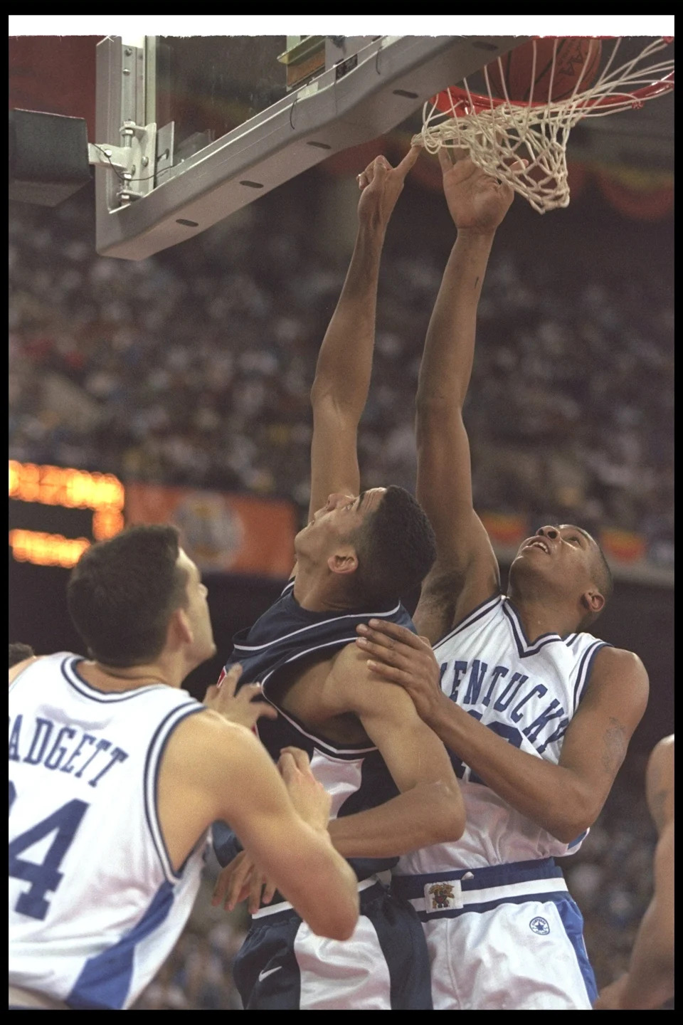 31 Mar 1997: Center AJ Bramlett of the Arizona Wildcats fights for the rebound with forward Scott Padgett and center Jamaal Magloire of the Kentucky Wildcats during the NCAA Championship game at the RCA Dome in Indianapolis, Indiana. Arizona won the gam